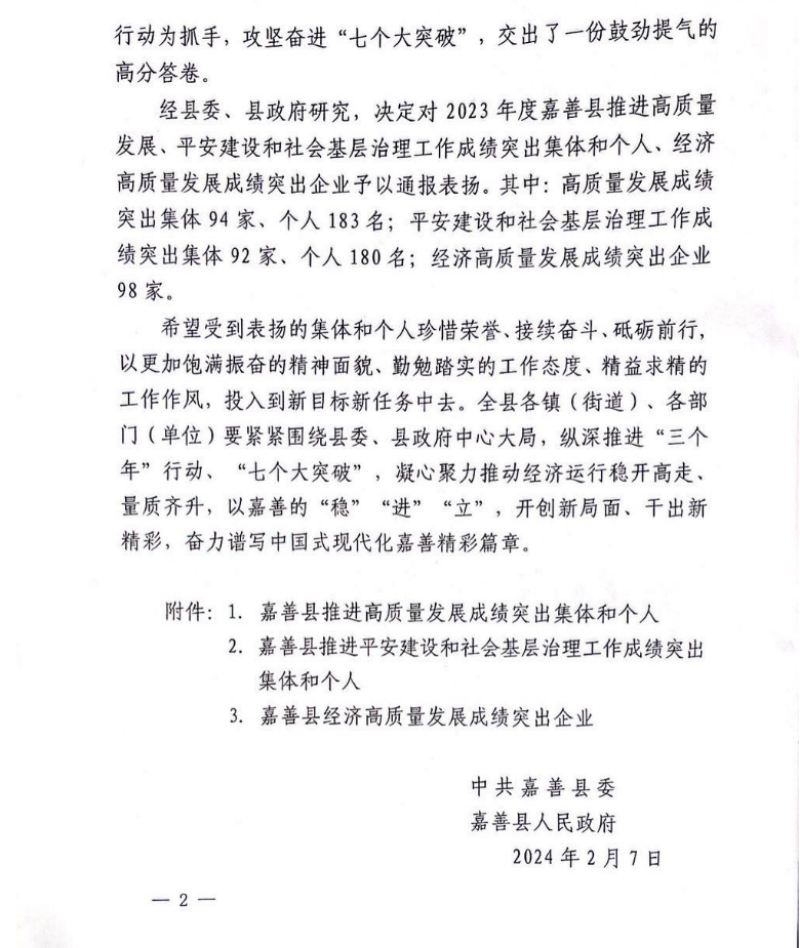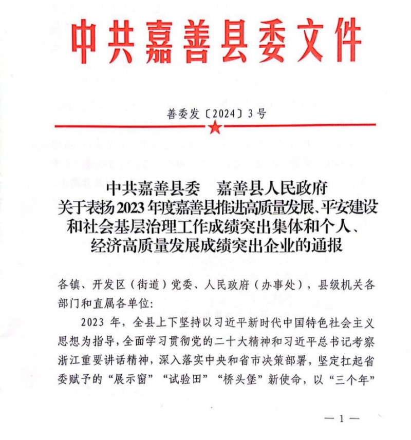 Good news | Warm congratulations to our company for winning the honorary title of "2023 Jiashan County Industrial Economy High-Quality Development Contribution Award"