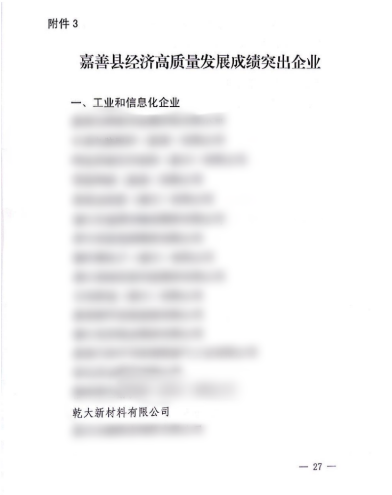 Our company Ganda New Materials Co., Ltd. won the“2023Annual Jiashan County Industrial Economy High-Quality Development Contribution Award”honorary title. Li Ming, supervisor of the company's board of directors, took the stage to receive the honorary medal on behalf of the company.